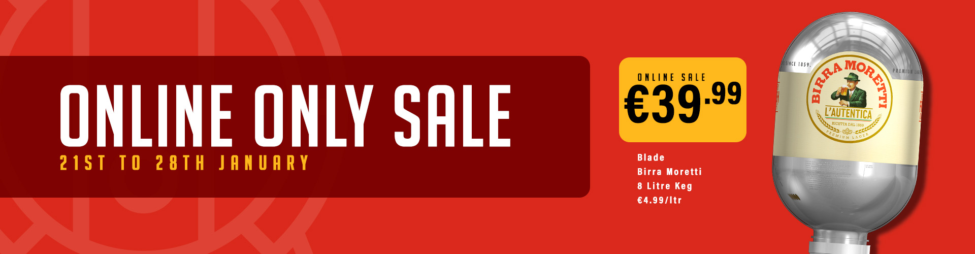 Sale Blade Birra Moretti 8 Litre Keg €55.00 €39.99 Online Only Sale! Available from 21/01/26 to 28/01/26 Select Store