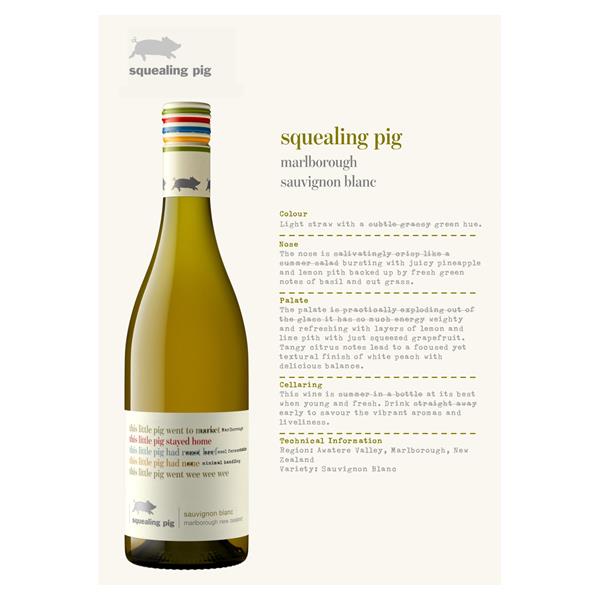 This little pig went globe trotting, discovering fine wines from the world's best vines. The grapes for this Squealing Pig Sauvignon Blanc were sourced from Marlborough, New Zealand. The wine was cool fermented and left on lees to develop an aromatic texture. Bursting with flavour, this wine is perfectly crisp and refreshing with tropical fruit flavours or pineapple, passionfruit and citrus.